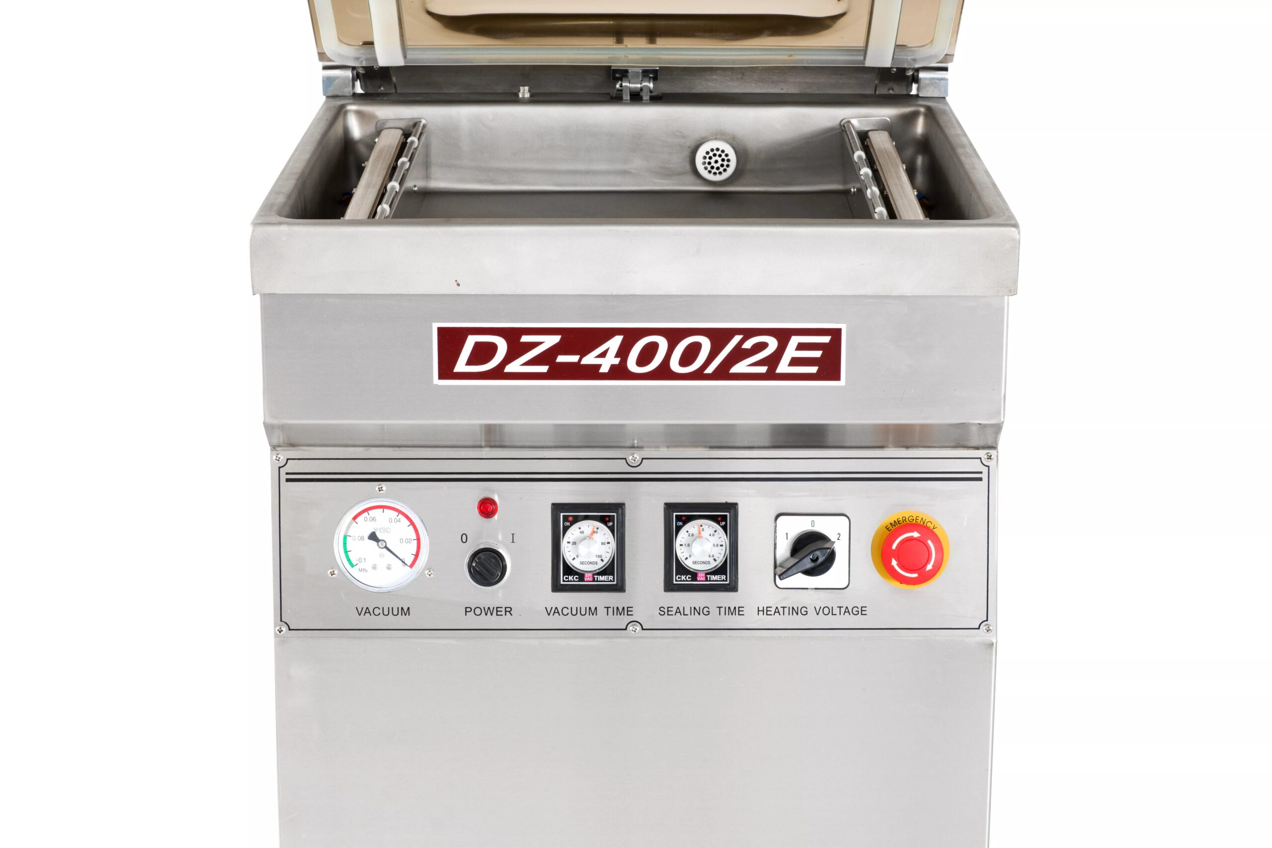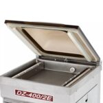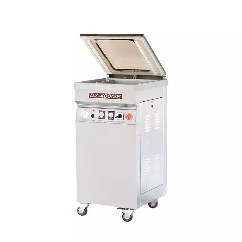 • The vacuum chamber is all stainless steel for the utmost durability and cleanliness. DZ-400/2E is a mid-sized industrial-grade self-standing vacuum packaging machine. It’s equipped with a heavy duty oil-filled rotary vacuum pump, a dual bar wide-seal sealing system, analog controls, and casters for ease of movement. Its chamber size allows it to be used of a wide variety of applications, as it can hold products of larger proportions.